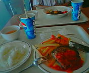 (奥:有吉 野菜カレーとペプシコーラとオニオンスープ / 手前:yuu エビフライハンバーグ・ライ